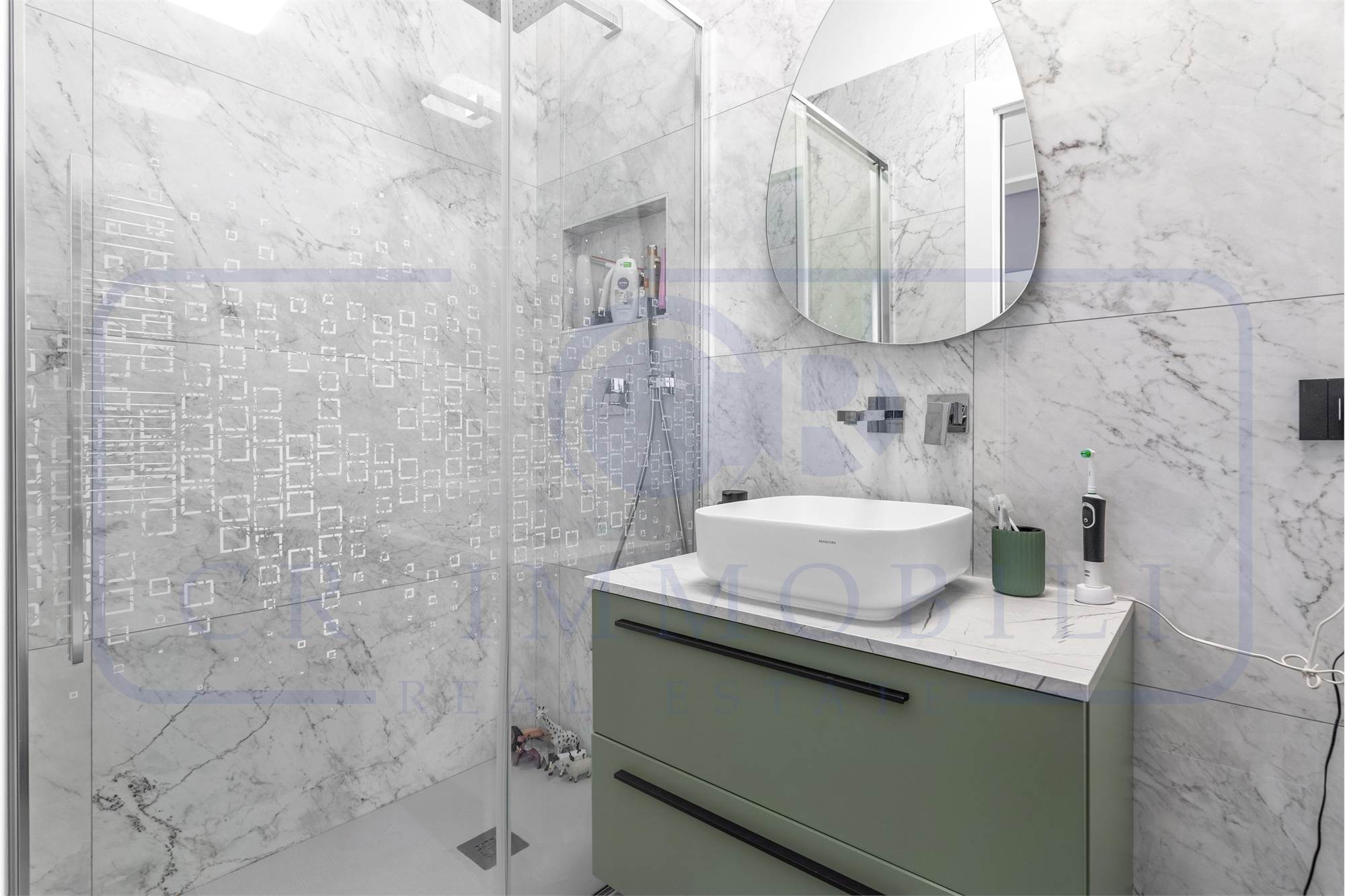 L’immobile è stato rifinito con materiali e finiture moderne e di qualità: pavimentazione in gres nella zona giorno, nel disimpegno, nei bagni e in parquet nelle camere, infissi in alluminio con triplo vetro, zanzariere su tutti gli infissi, porta blindata, aria condizionata, tapparelle motorizzate e videocitofono.
